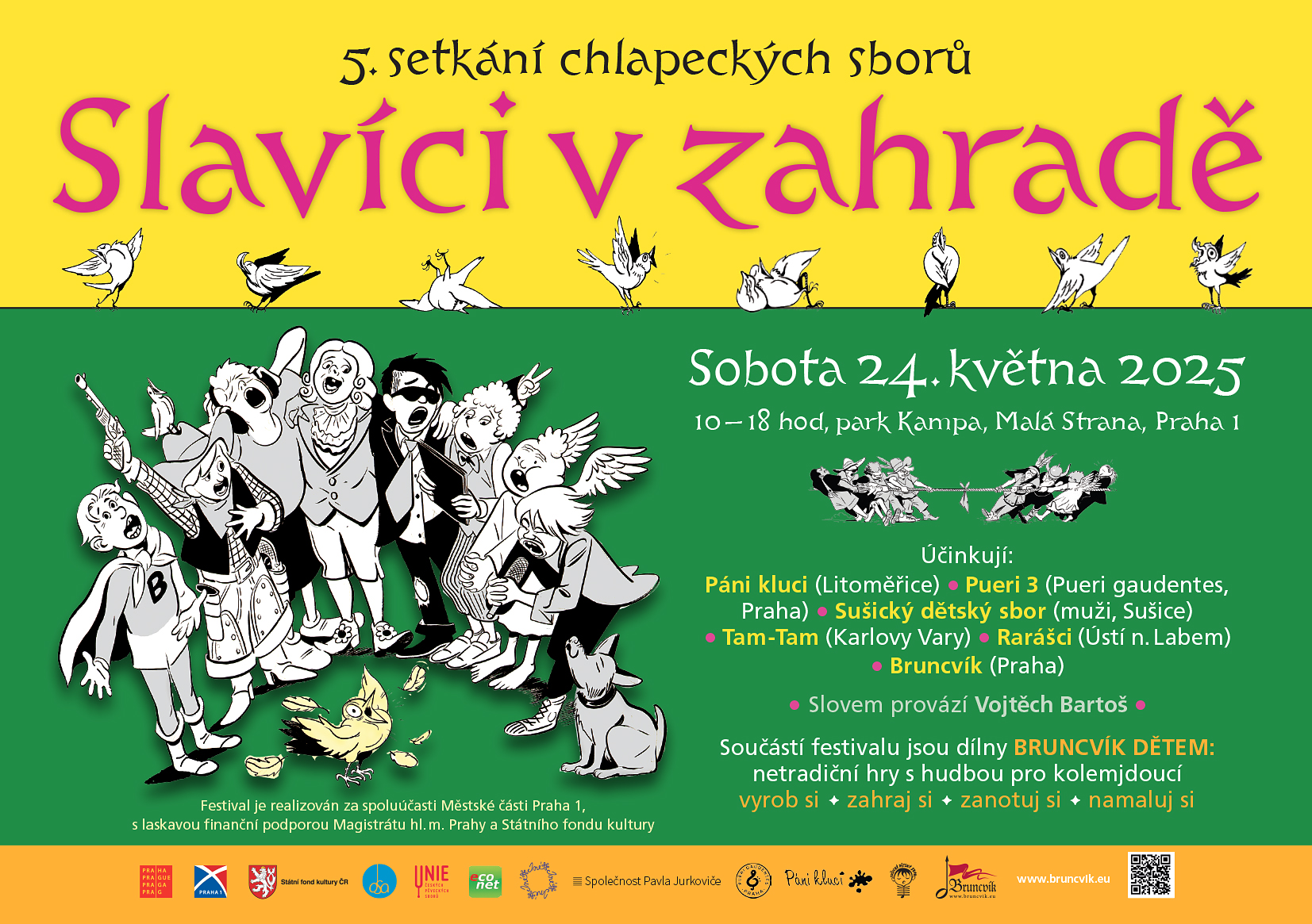Již popáté pořádáme festival chlapeckých sborů Slavíci v zahradě, v sobotu 24.května 10-19hod na Kampě. Dopolední hry a odpoledne zpěvy sborů, mezitím po celý den interaktivní stánky pro děti: Vyrob si, Zahrej si, Zanotuj si, Namaluj si.